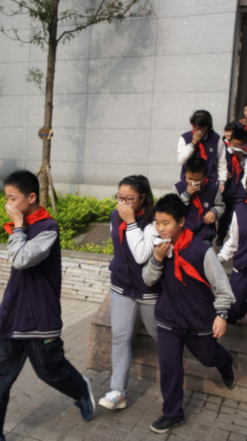 当警报响起后,当堂课的教师立即就位,组织学生从前后门有序疏散出教室;值班教师迅速赶往各楼层通道和转弯处,按规划好的疏散线路指挥学生下楼;校警、保安疾驰到教学楼外各要点,快速,有序,安全地将学生紧急疏散离教学楼,引导到指定的地点集中。整个演练过程始终保持严肃、紧张、有序,耗时四分半,达到了预期的演练目标。而平时最远的教室里的学生到达集合地点需十分钟以上。