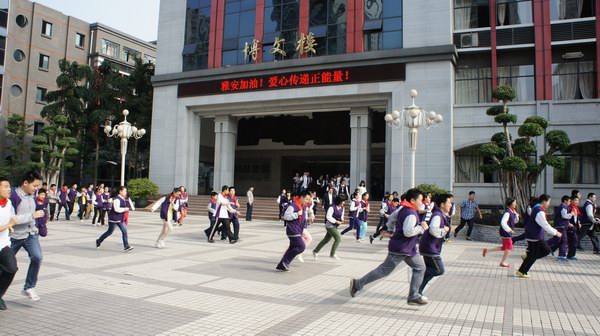 防震疏散演练后,学校领导利用国旗下讲话对全校师生进行了地震和防震知识的教育,并祈福雅安,加油四川。