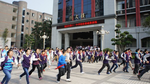 4月22日9:30,随着一阵急促的警报声,重庆市第十一中学校5千余师生鱼贯而出,安全有序的应急疏散,4分钟到达指定的安全地点。