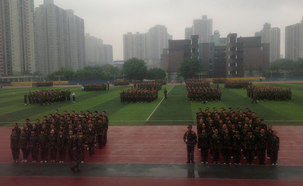 不论是烈日炎炎还是阴雨绵绵,我们都用铿锵有力的步伐来面对天气的变化,用响亮的口号展示着我们青春的力量。额头上的汗水将几缕发丝黏住了,坚毅的目光却死死地盯住前方;滴落的汗水将衣服浸透了,但没有人为了使自己凉快点而拉动衣服来散热;脸上划过的汗水模糊了视线但没有人动手将它擦掉。