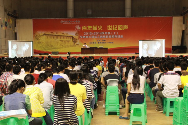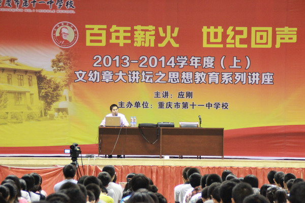 2013年10月13日,重庆十一中“文幼章大讲坛”之思想教育系列讲座第一讲在学校体育馆正式举行,在13日和14日连续两天的时间里,主讲人应刚老师分别为高2016级和初2016级的同学们举行了题为“百年薪火,世纪回声——重庆十一中百年历史经典回眸”的文化讲座。
