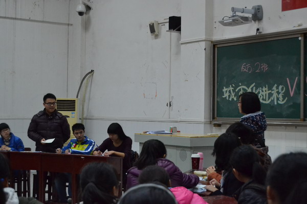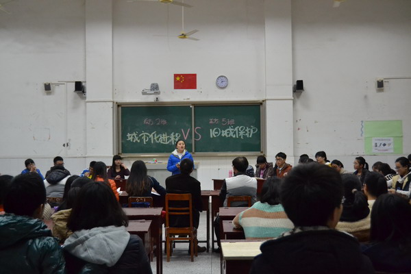 这是高二五班与二班举行的首届辩论赛,黑板上写着显眼的辩题——正方五班持旧城保护更为重要的观点,而反方二班则认城市化进程更为重要。这场辩论赛将此为主题展开,本着“友谊第一,比赛第二”的精神,双方将对我国现代化建设与发展中面临的突出矛盾——城市化建设任务的迫切与古旧文物建筑的严重破坏——进行针锋相对的辩论。