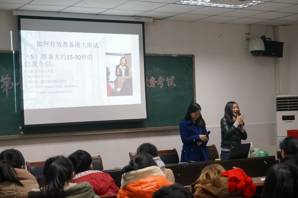 第二部分由高2011级28班的龙清清同学介绍2014年香港大学内地招生计划及申请流程,清晰地告知各位同学申报港大的具体步骤。在事前获悉高三同学们普遍希望对高校自主招生面试有更多了解,因而本次分享会的第三部分则聚焦于港大全英文面试的流程以及亲历者们的经验借鉴。龙清清同学首先向同学们介绍了大学面试的准备工作、小组面试的试题解析和面试技巧,然后展示出几道面试真题,邀请现场的同学模拟面试的环境各抒己见,小试牛刀。期间不少同学踊跃发言,就“政府是否应该控制网络”等议题提出独树一帜的观点,令现场同学眼前一亮。