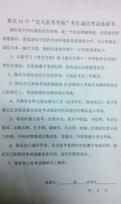 1:重庆11中“无人监考考场“考生诚信考试承诺书