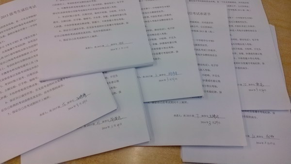 为了培养学生的自主管理与自主学习的积极性、主动性,培养学生的责任、担当意识,高2015级在本次期中考试中特设了“诚信考场”。“诚信考场”将无老师监考,申请参加“无人监考考场”考试的考生在接受年级与班级的考前诚信教育培训并作出诚信考试承诺后,可以参加“无人监考考场”的考试。