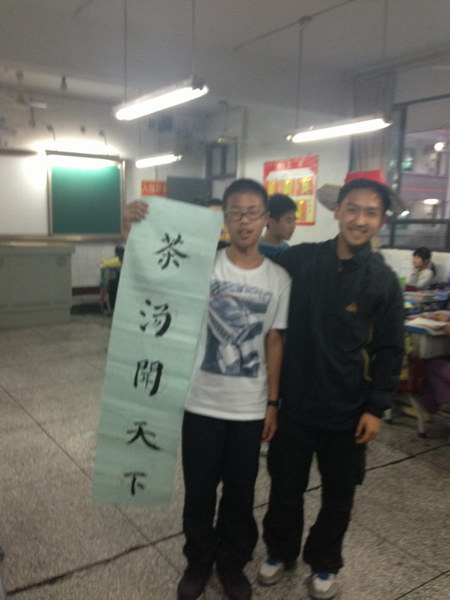 首先,冯俊端着一碗水,眼珠机灵地转着,快步走到台中间,还围了条围裙,搭了根白毛巾在肩上,活脱脱一个小伙计。他操着一口天津腔:“嘿,这茶汤,真是绝了!闻一下就巴不得来上几大碗!嘿,杨家茶汤哎——”说着,将鼻子凑到碗边,猛吸了一口气,一种满足便在脸上弥漫开来,仿佛面前真是一碗喷香的撒满芝麻的茶汤。接下来的表演更是精彩绝伦,同学们连声叫好,掌声不断……