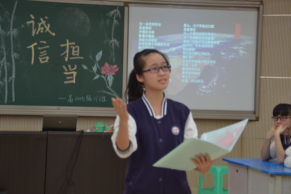 本次班会,每一位同学都主动积极地参与到活动筹备中,无论是《星空下的承诺》的歌词创作,还是一系列“诚信担当小故事”的精彩演绎,抑或是犀利的时评和倾情的朗诵,以及诙谐而深刻的小品,都凝结着大家的智慧与汗水。我们共同担起班级建设的责任,兑现了我们担当做人的承诺!