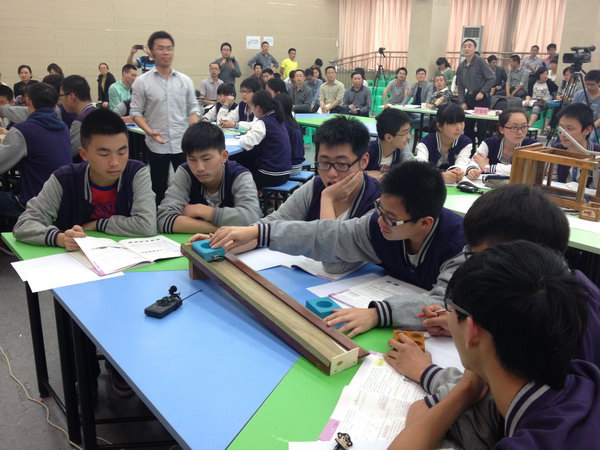2014年5月8日,由重庆市教科院中学物理实验室主办、我校承办的高中物理青年教师优质课大赛决赛进行到了第三天,今天的比赛课题是《动量守恒定律》。总共有来自西南大学附属中学、清华中学等13位中学青年教师进行了课堂教学展示。
