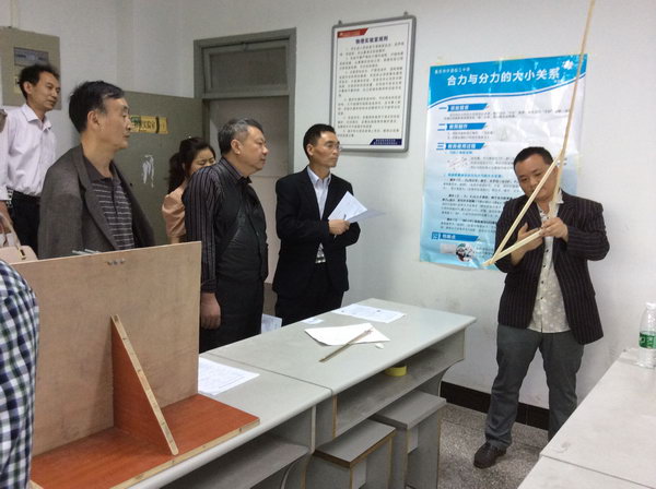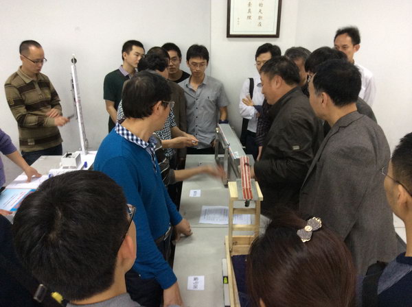 下午5点,重庆市中学物理自制教具评比展示开始在我校科技楼物理实验室进行。来自重庆外国语学校、育才中学、大足中学、开县临江中学等多个学校的选手向大家展示了自制教具。参展的教具丰富多样,如显示合力分力关系的三角架、牛顿第二定律探究实验仪、最大静摩擦力演示仪、高斯加速器、碰撞探究仪、声音的产生演示仪、平面镜成像演示器等。参展的每一台教具都是由老师们根据实际教学经验创造或改造而成,均代表了参赛选手的智慧和心血。到场的专家评委均与各个选手悉心交流,肯定了仪器的创造性和实用性,也提出了一些仪器改进的宝贵经验。
