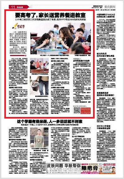 昨日,重庆十一中,送饭的家长陪着下课后的孩子吃饭。本组图/重庆晨报记者 胡杰