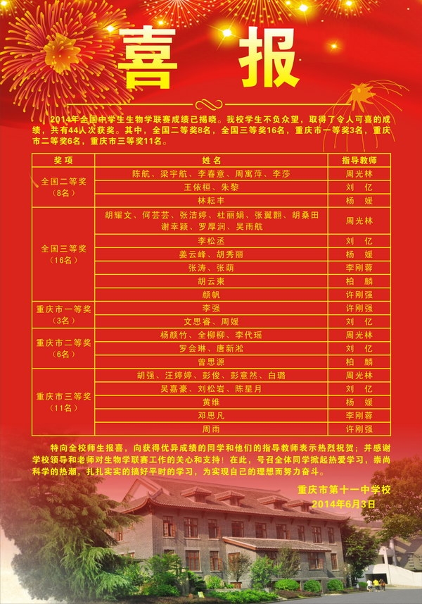 我校学生参加2014年全国中学生生物学联赛喜获佳绩