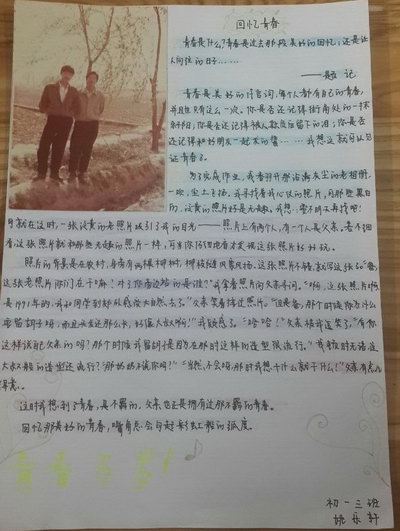 6月初,我们初2016级3班在语文张老师的组织下开展“老照片下的故事”手抄报展示活动。本次活动的初衷是让同学们感受亲情、友情、热爱自然之情。同学们投入了极大的热情,积极参与。老照片的展示,有的是与儿时小伙伴们的合照,有的是与家人的旅行,还有的是一次值得纪念的活动。它不仅为走廊添上了一段漂亮的风景线,也锻炼了同学们的动手实践能力。此次活动更切合学校的办学理念,让学生成为博采广撷、修身励志、人格完满、全面发展,并体现十一中文化特色的学生。此次活动得到了班主任赖老师的大力支持。