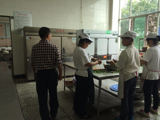 (图3: 严格检查每一道工序,保证校园食品安全。)