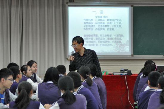 课堂上,来自内蒙的刘文宝老师在解读江南气息浓厚的《望海潮》一课里,用低沉雄浑的声音,将“精细阅读”与“深入思考”有机二者结合,同时注重学生的自主表达欲望与真实阅读体验的反馈,通过学生大声朗读、自由朗读等方式一下子就调动了学生对诗词学习的渴望与积极性。课堂上,刘老师注重学生思维的引导,扮演着课堂的组织者,而学生们争先恐后地发言表达,交流,探讨。课堂氛围热烈,学生积极主动,一个睿智沉稳的老师展现得淋漓尽致。