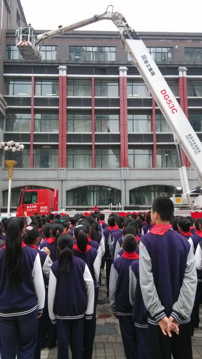 “呜啦……呜啦……”,上课时突然响起了一阵火警警笛,窗外浓烟滚滚。我校师生迅速有序地向小操场撤离,不到两分钟,就安全到达安全区域。消防车很快赶到,高高的云梯很快架好,消防官兵迅速组织施救、灭火。2分钟后,被困天台人员被扶上云梯,受伤学生被担架抬出火场,经校医检查伤情并简单处理后送往医院,火警被成功处置。现场立即响起雷鸣般的掌声。
