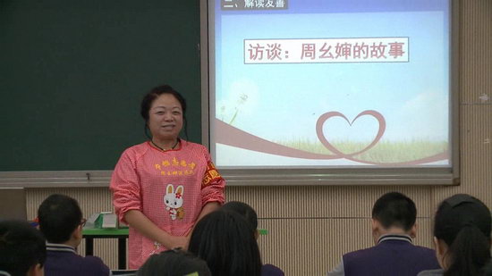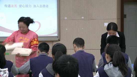 谭老师先给大家播放了一段小视频《一个人温暖一座城》,全国优秀志愿者、全国三八红旗手、感动重庆十大人物周纪萍30多年来义务照顾孤寡老人的感人事迹让在场全体师生无不震撼;接着学生朗诵感动重庆组委会授予的颁奖词更让大家对周幺婶的友善与执着佩服得五体投地;更让学生们欢欣鼓舞的是今天谭老师把周幺婶请到了我们的课堂与同学们面对面地交流,当周幺婶给大家分享自己的事迹时,一个个感动得潸然泪下;当同学们得知周幺婶从照顾孤寡老人到现在热心各项社区公益服务,从一个人到现在组建了200多人的洗衣队,6000多名志愿者参加的爱心队伍,同学们深深地领悟到友善在传递,文明在发展;最后同学们决心接下友善的接力棒,加入志愿者行动,成为“小幺婶”中的一员,同学们填写了志愿表,周幺婶亲自给同学们颁发了聘书,佩戴了红袖章,大家一起高声宣誓。