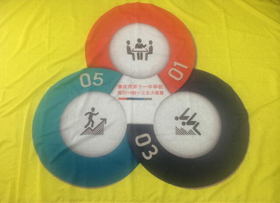 走在最前面的六个熊猫高举“联盟旗”,旗帜右下方的运动员比赛图片,意味着文科实验班同学阳光青春、积极参加体育锻炼;左下方沿云梯拾级而上的人物图像,表现了孩儿们不畏艰难险阻,勇攀高峰的顽强意志;正上方的三个同学坐在方桌上学习的设计方案,看出文科实验班孩儿合作探究学习已刻苦铭心;三环紧连的整体设计方案包含了三个实验班孩儿将精诚团结、相互帮助、努力拼搏、共同进步的可贵品质。