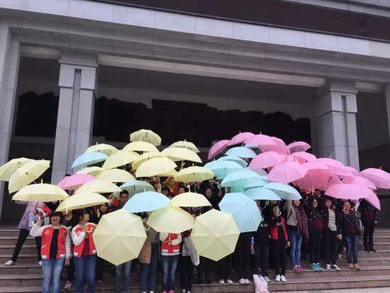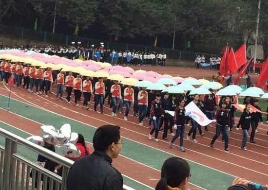 队伍的正中央,112名女生争先恐后给16名男生撑起五彩缤纷的小花伞,彰显了文科实验班孩儿们“今天我为你遮风雨,明天你为我挡太阳”的团队合作精神。