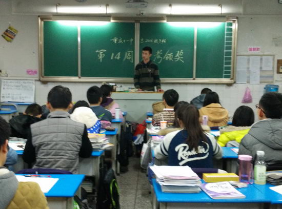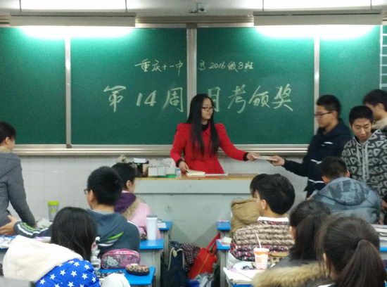 2014年12月10日,高2016级8班在教室举行第14周月考颁奖及后期动员大会,在班主任助理李林洁的主持下,83人次获奖学生一一登台领奖,教室里充满了朝气、欢声、思考。