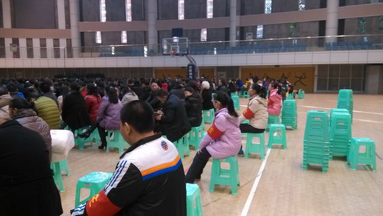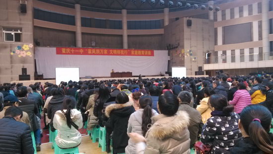 12月19日下午3点,体艺馆的天窗映着宝蓝色的天空,伴着《春秋荣光》宣传视频的乐声,初2017级的家长们陆续走进体艺馆的大门。四壁的聚光灯将体艺馆主席台映照得分外明亮,束束暖光也吸引着家长们颗颗急切的心。