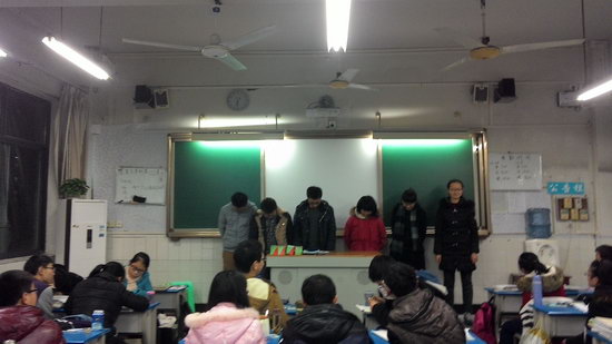 2015年1月5日晚上6:05,我校高2016级9班学习部成功主办了新年伊始的第一次班会活动。本次班会活动以“冲刺期末的誓言”为主题,班级每一位同学均上台用自己小组特有的方式表达出冲刺期末的青春誓言。