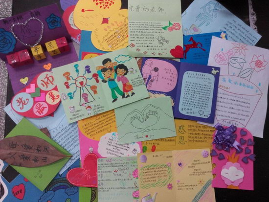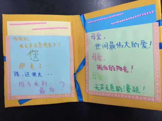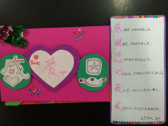 主题一确定,孩子们紧接着确定好自己想要感恩的对象,有的感恩老师,有的感恩父母,还有的感恩朋友。随后孩子们便欣喜投入到卡片制作之中。在孩子们的DIY作品中,个个都新颖别致,有的是立体式的卡片,有的是折叠式的卡片,有的还精心贴上了水钻及自己折叠的花朵,更难能可贵的是,每一张卡片都融入了孩子们的真情实感。有一个孩子这样写道:“妈妈,谢谢您为我做的一切,一路走来,您实属不易……您的眼睛不好,以后我就做您的眼睛,真不争气,我是哭着写完这段话的,妈妈,我爱您!”