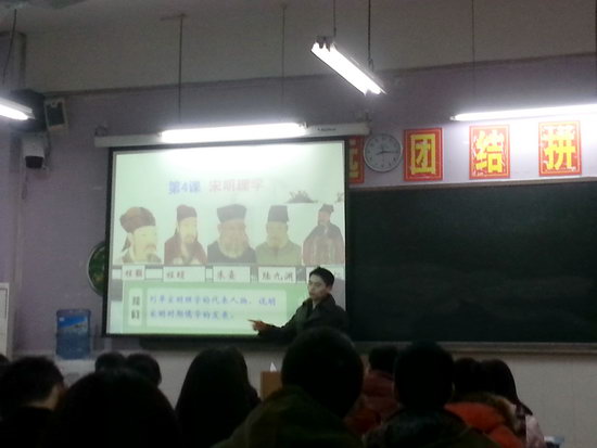 “为天地立心,为生民立命,为往圣继绝学,为万世开太平”,使命、担当与责任,中国儒家士大夫的浩然正气,中华民族传统精神的脊梁,让人震撼、叹服。这里是2014年12月15日高2015级历史组邹树明老师和汪建华老师的《宋明理学》同课异构活动现场。