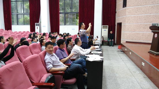 为了营造良好的比赛氛围,给青年教师以充分展现风采的舞台,领导小组特意将地点放在了科技报告厅,并制作了充满激情和动感的背景幕布,安排了主持人、计时员、摄影、新闻宣传等工作人员,还有意将在年级实习的老师共40余人邀请到现场进行观摩。你要知道,其中有些参赛老师还是他们的指导教师呢。这样一来,我们的参赛者更是做了精心准备,精神抖擞的投入到了比赛之中。