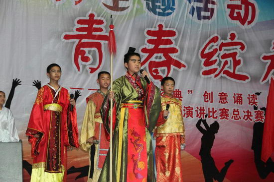 看那台上:初一(10)班的同学们身着古装带你走进历史悠悠长河中,领略那“窈窕淑女,君子好逑”的婉约含蓄;初二(14)班的同学们穿上简单朴素的T恤,真诚地吟咏古今名篇……