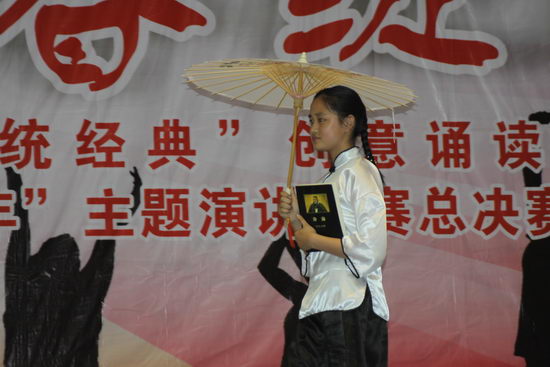 2015年5月19日下午第三节课,经典诵读可谓精彩纷呈,而将整个比赛推向了最高潮却是初一(8)班的诵读《雨巷》,“男”主人公深情的表白,姑娘太息般的目光,结着愁怨的背影与主演相应和,演绎得恰到好处……
