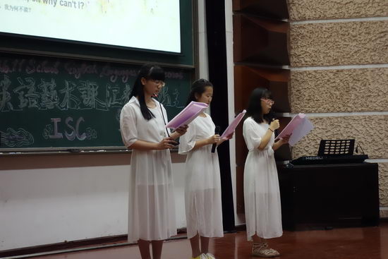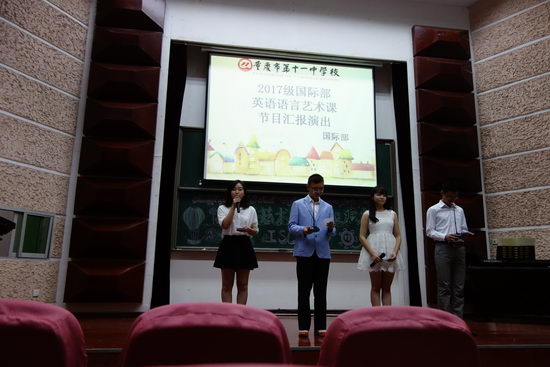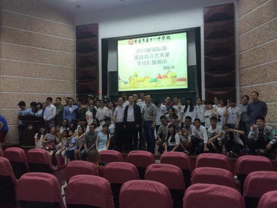 2015年6月14日晚,我校国际部在学校科技报告厅举办了高2017级英语语言艺术课汇报演出活动。这次汇演由四位双语主持人主持,所有节目均由国际班同学自行准备并用英语进行表演。
