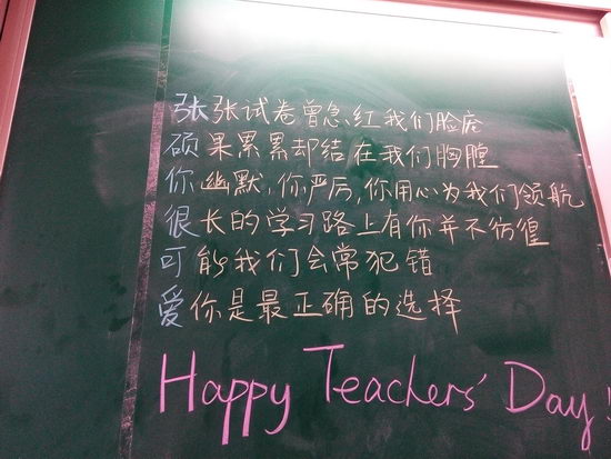 9月9日晚就收集完毕的来自各科科代表的小纸条,终于在教师节当天的黑板上露出了真面目。