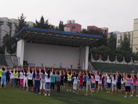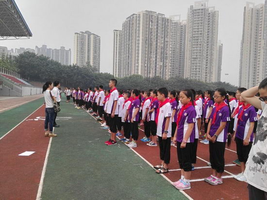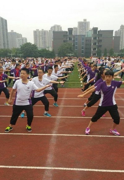 9月8日,阴,天气凉爽,我校——重庆十一中,在运动场上,教初中年级的学生们做武术操——《英雄少年》。随着音乐的响起,同学们昂首挺胸、陆陆续续地来到运动场上,整齐地站好了队形。紧接着,领操员就位,便开始学操。