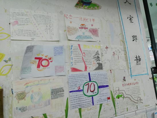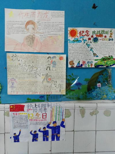 为了纪念这次的庆典,我们初一年级举办了手抄报比赛的活动。从一张张的手抄报中,看得出来同学们对这次庆典的一切皆很重视,手抄报上那一串串令人热血沸腾的文字,展示了过去的历史。战火的硝烟已经散去,我们生活在和平的年代,我们中学生更是深刻的知道,这和平的年代来之不易,是先辈们用热血换来的,我们应更加珍惜。