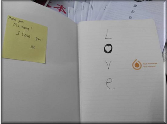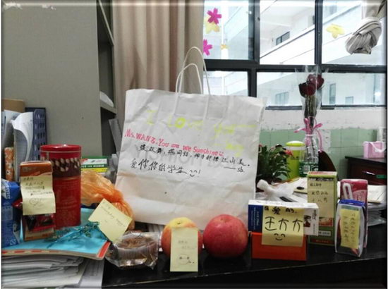 次日,王老师照常来上班,可是不寻常的是,她的办公桌上多了一堆东西,凑近一看,发现是一堆糖、饼干、牛奶、饮料,还有一些同学制作的卡片,上面写着“王老师我爱你”,“爱你的学生全体致上”,“王老师永远十八岁”等,这每一句话,每一个字都深深地触动了王老师的感情,幸福、感动、快乐如暖流一样涌进王老师的心里,这些都是同学们对老师的报答,对老师的爱和感激。