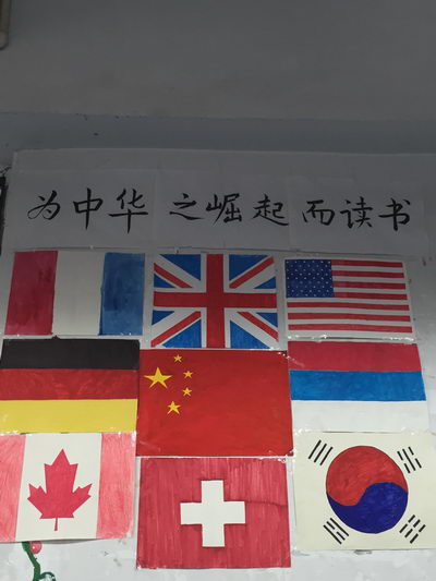 不仅如此,在9月27日,宣传委员就把全班同学的想法体现在了教室的布置上,醒目的五星红旗屹立在其他国旗的中间,象征着我们要“为中华之崛起而读书”,希望同学们能好好学习、天天向上,不负使命,将来振兴中华!