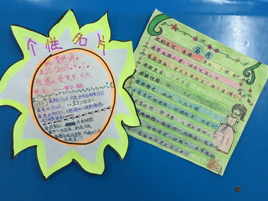 为了帮助同学们加深彼此的认识,为了让每一个同学更加深入地了解自己的同窗,为了让同学们树立梦想意识。在国庆假期的时候,班级的每个同学都精心地制作了自己的特色名片,很多同学们的名片色彩缤纷很是抢眼,上面绘的图案以卡通人物、动物居多,还有向日葵、音符等等能够代表个人特色的绘画符号,在同学们的特色名片上除了有姓名、学校、班级外,大家还会在名片上留下自己的家庭电话、生日、QQ号、星座,有的还会写上自己的偶像名字、爱好、梦想、想去的地方等。在下周一班会课的时候,班级的同学们会挨个来讲台上展示自己的名片,在展示过程中,每一个人都会对自己的梦想进行阐述,因为名片上涵盖的信息很有趣,同学们对此很是期待。