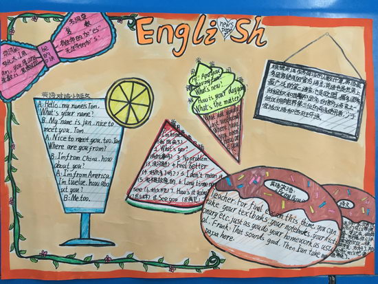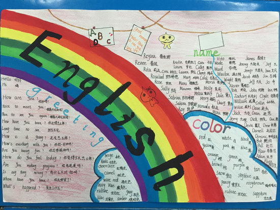 除了制作个性名片之外,同学们还在“Color”、“Greeting”和“English small story”中选择了自己喜欢的主题,并围绕主题制作了英语手抄报,每一张手抄报都能看到同学们的用心,更能够看到同学们已经在英语学习中找到了兴趣。