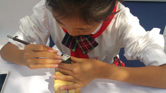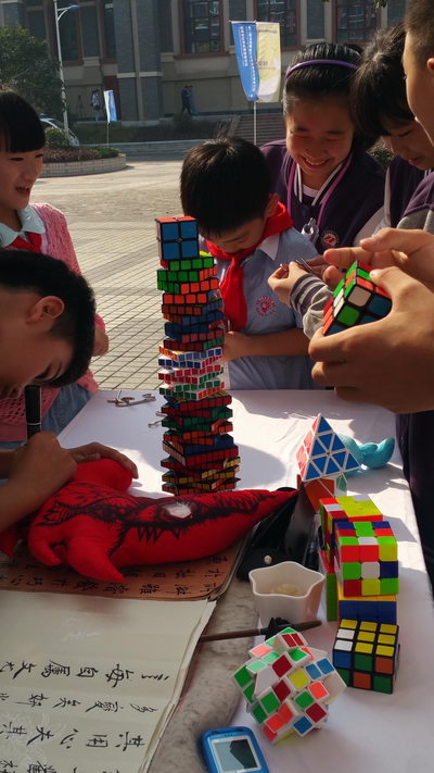 一下课,全校师生蜂拥而至,参观各个学校的特色。珊瑚实验小学的“魔方达人”,一两分钟便能将魔方还原,着实令人钦佩。江南小学展示了学生的美术书法作品,一副副生动、栩栩如生的图画,一副副刚劲有力、笔锋如尖刀的书法作品,无不让人啧啧赞叹。川益小学学生的陶瓷作品,更是让人刮目相看。会上还有学生抖空竹的,有弹琵琶、古筝的,还有画扇面的,篆刻印章的等等,各校各生的才艺看得我们眼花缭乱,目不暇接。