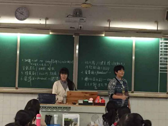 每一列同学为一组,想出一种方案,并派代表上台介绍并写下关键词,最后由全班同学举手表决。但由于我们的班主任名爱莲,所以大多数的表演方式里都有《爱莲说》,令被我们要求跳舞或穿奇装异服的爱莲表示很无奈。