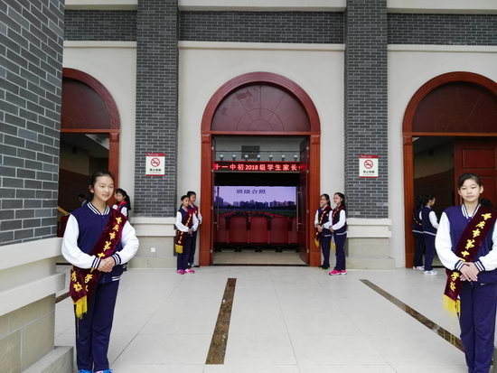 家长会开会之前,年级从各班挑选了两名学生进行礼仪培训,负责家长会的接待工作。下午两点半,各礼仪同学到位,负责引导家长入座。会场秩序井然,负责礼仪的同学热情有礼,获得了家长的一致好评。