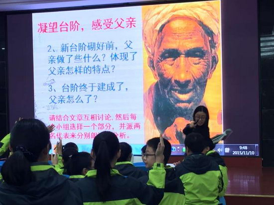 第一个环节先是由两校各自派出的上课教师周静老师和李宛颦老师分别说课,然后教研员曾老师带领参会老师们一起召开“课前会议”,共同讨论并确定了本次课堂观察的维度和量表。第二个环节是周、李两位老师,分别就八年级上册三单元课文《台阶》上了两节别开生面又各具特色的课。带领着在场的老师和学生一起去探寻一个发生在上个世纪六十年代初的故事。故事中一位农民父亲用大半辈子的时间造了一栋有高台阶的新屋,新屋造好了,父亲却老了,累垮了。第三个环节是两位上课老师的反思和总结。第四个环节则是各观察小组讨论并汇总观察结果,形成小组意见,然后全体参会老师进行交流和反馈。经过这样的一次两校共同教研活动,老师们都纷纷表示收获良多,对平时的教学指导意义重大。