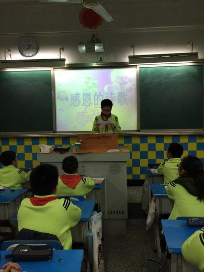 在该班同学罗雪丹、陈泓羽的主持下,同学们齐唱着班歌,拉开了这次班会的序幕。班会中,周圣博、江旭坤同学深情地朗诵了感恩的诗歌,感染同学们的心灵;向娜同学引经据典,讲述了子路借米孝敬父母的故事,让大家明白到“百善孝为先”的道理;甘宇杰、代佳怡、周圣博等同学通过自己的亲身经历,感谢父母在自己生病时连夜守候而熬黑了眼圈;何灵立可则分享了自己手臂受伤的经历,感谢文老师和同学们在受伤时亲切地关心和照顾,尤其是当岳文娟同学讲述她手摔伤加上发烧,父母对她的悉心照顾时,不由得哽咽起来。同学们也被深深的感染,眼圈都变得红红的。在随后的“看视频、谈感受”的环节,同学们通过观看《让我一生守护你》的短视频,让同学们明白到父母无私的关爱,我们要感恩父母,不要等父母伤透了心才弥补的道理。