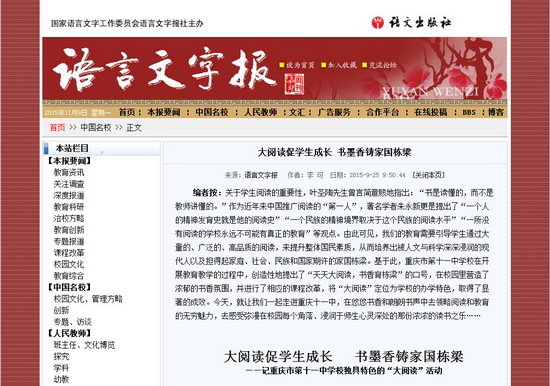 编者按:关于学生阅读的重要性,叶圣陶先生曾言简意赅地指出:“书是读懂的,而不是教师讲懂的。”作为近年来中国推广阅读的“第一人”,著名学者朱永新更是提出了“一个人的精神发育史就是他的阅读史”“一个民族的精神境界取决于这个民族的阅读水平”“一所没有阅读的学校永远不可能有真正的教育”等观点。由此可见,我们的教育需要引导学生通过大量的、广泛的、高品质的阅读,来提升整体国民素质,从而培养出被人文与科学深深浸润的现代人以及担得起家庭、社会、民族和国家期许的家国栋梁。基于此,重庆市第十一中学校在开展教育教学的过程中,创造性地提出了“天天大阅读,书香育栋梁”的口号,在校园里营造了浓郁的书香氛围,并进行了相应的课程改革,将“大阅读”定位为学校的办学特色,取得了显著的成效。今天,就让我们一起走进重庆十一中,在悠悠书香和朗朗书声中去领略阅读和教育的无穷魅力,去感受弥漫在校园每个角落、浸润于师生心灵深处的那份浓浓的读书之乐……