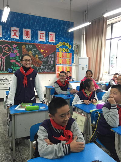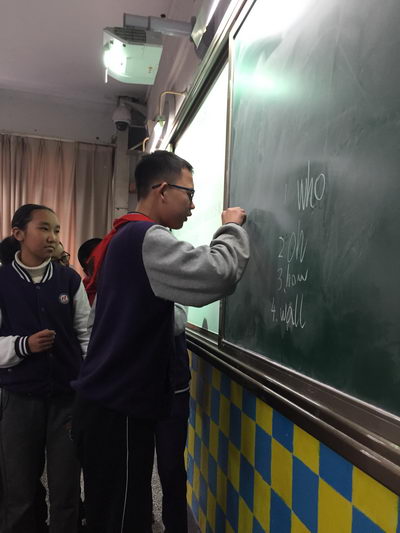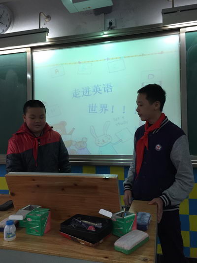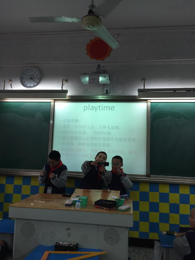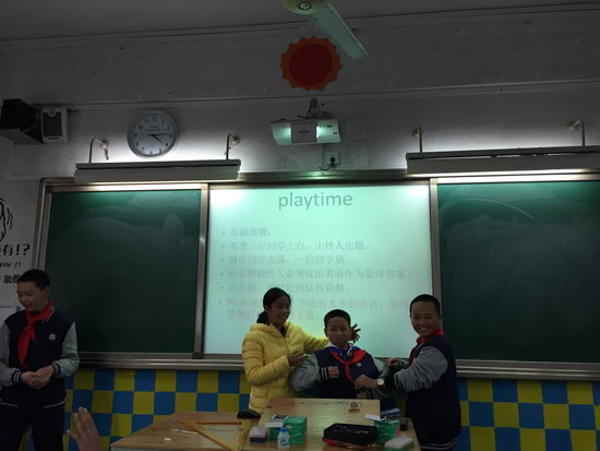 2015年12月7日,星期一下午的班会课又到啦!初2018级10班的教室里不时传出同学们开心的笑声,他们是在做游戏吗?No,No,他们正在进行的是该班快乐学英语活动中最精彩的“你比我猜”环节呢。该环节需要三位同学上台,主持人出题。两位同学表演,一位同学猜。最后猜题的人必须说出英语作为最终答案,用时短的队伍获胜。只见讲台上两名同学竭尽全力用夸张的肢体语言和提示性语言来模仿题目中的物品特征,猜的人也绞尽脑汁地猜测,并将认为对的名字用英文念出来。一个个离题万里的名字从被猜的同学口中不断冒出,同学们的眼泪都笑了出来。在随后进行的重复接句、单词接龙等活动中,教室里的笑点一直都没停过,气氛丝毫不亚于电视里的综艺节目。