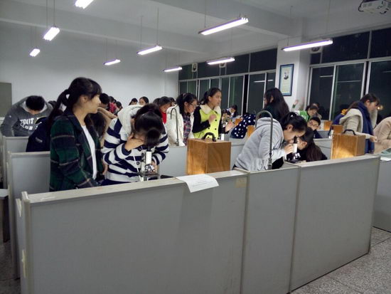 每个班级都按照一定的顺序进入实验室。实验室的桌上摆放着器具,像是等待检阅的士兵们,抖擞精神。实验室里只有玻璃仪器发出轻微的声响和一个个专注的眼神。一星燃烧的火花,一点黑色的灰烬,一声记录实验的笔划出的音符,汇成奇妙的实验。