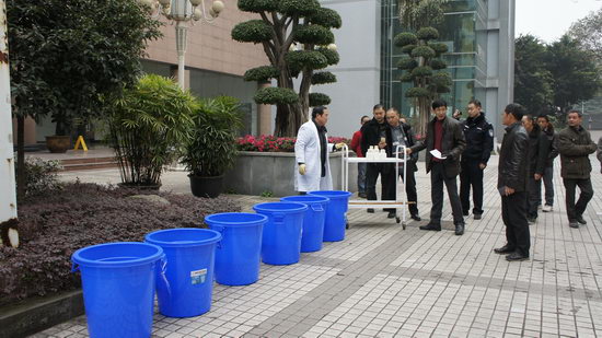 行动中,公安部门的警官和学校教务处、安全办、总务处、办公室、信息中心负责人及学校化学试验员一道,从库房取出硝酸铵,运送到空旷的安全地点,共同检查核实后按比例加水稀释,并由绿化工在大家的监督下将稀释后的溶液作为肥料对校园的花草进行施肥。全过程摄影并录像。