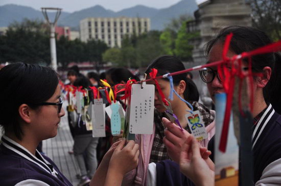 3月21日,我校第三届大阅读活动周中,“让书笺飞”活动拉开帷幕。初一、初二、高一、高二各年级学生亲自制作或收集的书笺悬挂于校园中的不同地方,每个同学都能够方便地观赏。