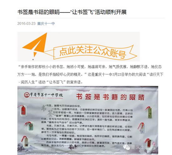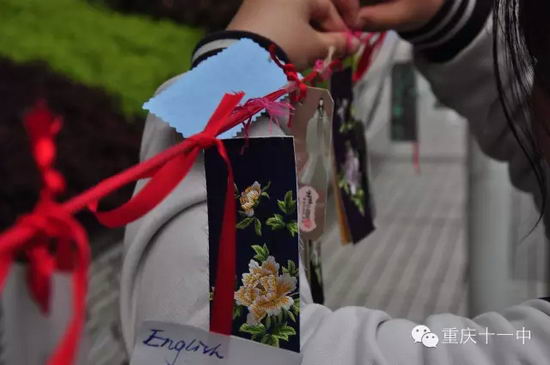 “亲手制作的那枚小小的书签,她娇小可爱,她温润可亲,她气质优雅,她静默不语,她仪态万方……她,是我们手指轻叩心灵的精灵。”这是重庆十一中3月23日举办的大阅读“读行天下·阅历人生”活动“让书签飞”的宣传语。