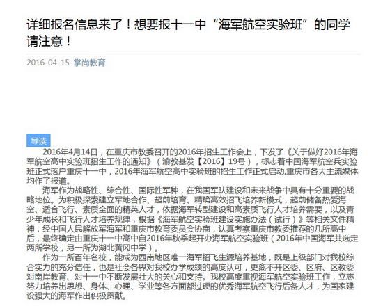 2016年4月14日,在重庆市教委召开的2016年招生工作会上,下发了《关于做好2016年海军航空高中实验班招生工作的通知》(渝教基发【2016】19号),标志着中国海军航空兵实验班正式落户重庆十一中,2016年海军航空高中实验班的招生工作正式启动,重庆市各大主流媒体均作了报道。